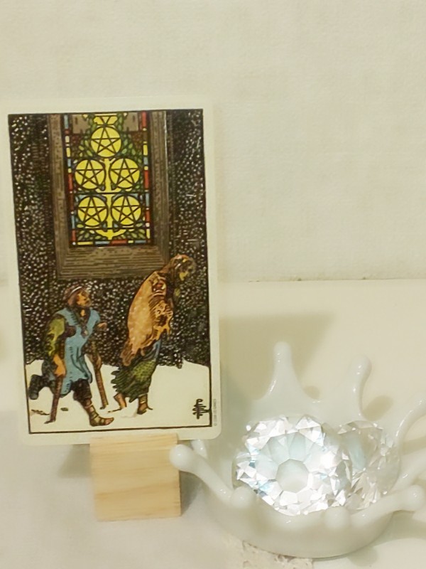 【ペンタクルスの5】「今あるもの」に感謝をしよう。雪の中をとぼとぼ歩く二人の人物が描かれています。二人はぼろぼろの衣服、怪我もしているみたいです。